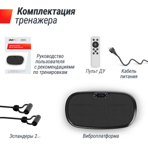 Виброплатформа, кабель питания, пульт управления, эластичный трос (2 шт.), руководство пользователя